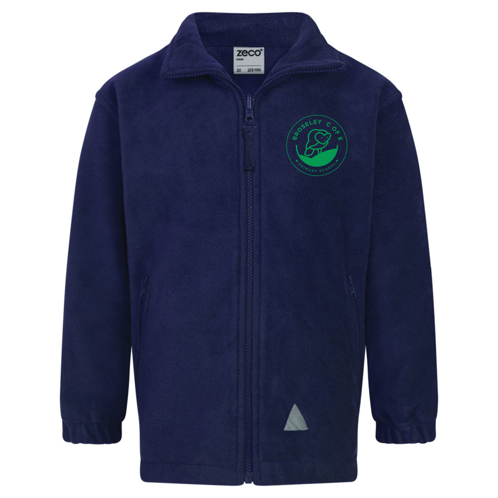 Navy Fleece with embroidered school logo Sizes SIZE GUIDE: Click here CONTENTS 330gsm heavyweight fabric Anti-pill fleece fabric YKK zips Elasticated cuffs Full zip fastening Front & back reflectors 2 front zip pockets
